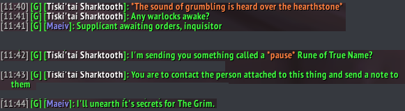 I'm interested in The Grim's take on RP (that is, always being IC). Normally my experience has been say/yell/guild/etc understood IC, as well as world PvP events, but RPing out instances sounds a bit weird to me. I personally dislike ((OOC brackets)) at least for extended conversations (use OOC channels, people!) though the outright prohibition on that also seems weird. I'm open to try it though.